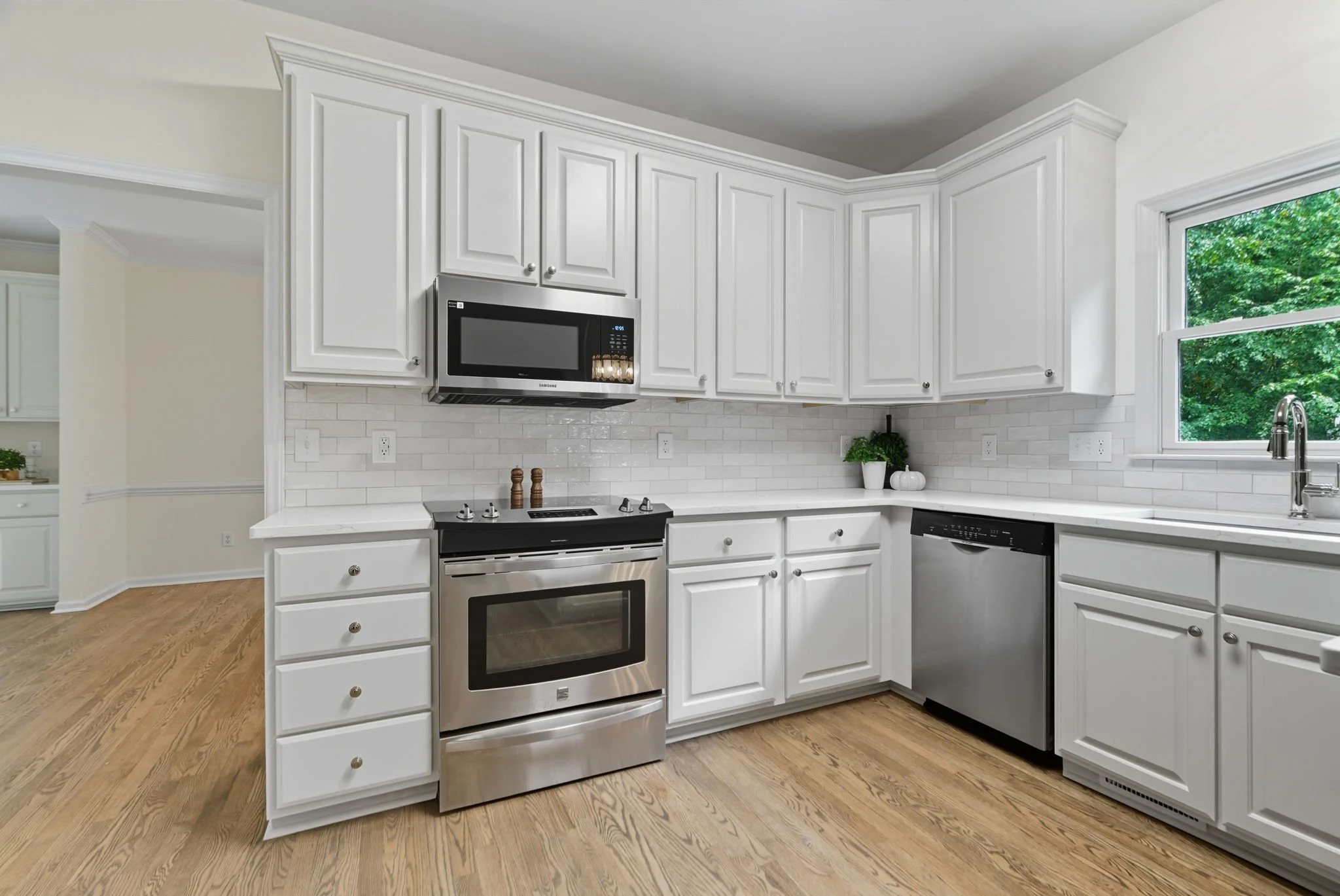 Bright, modern kitchen with white cabinets, stainless steel appliances, a white countertop, hardwood floors, and a window showing greenery outside.